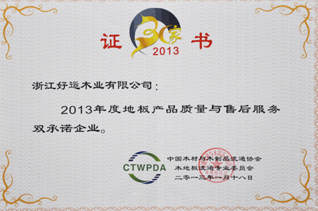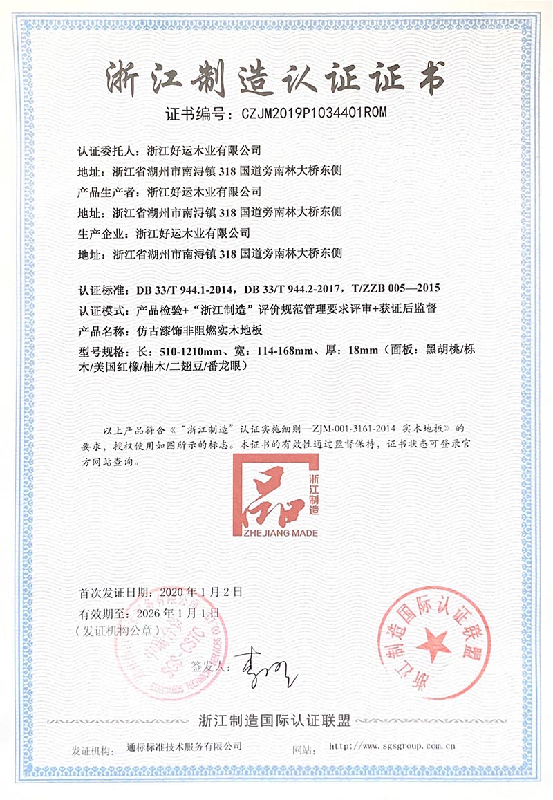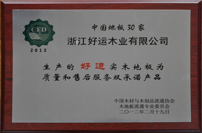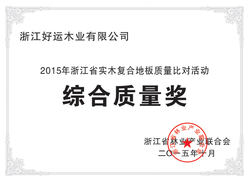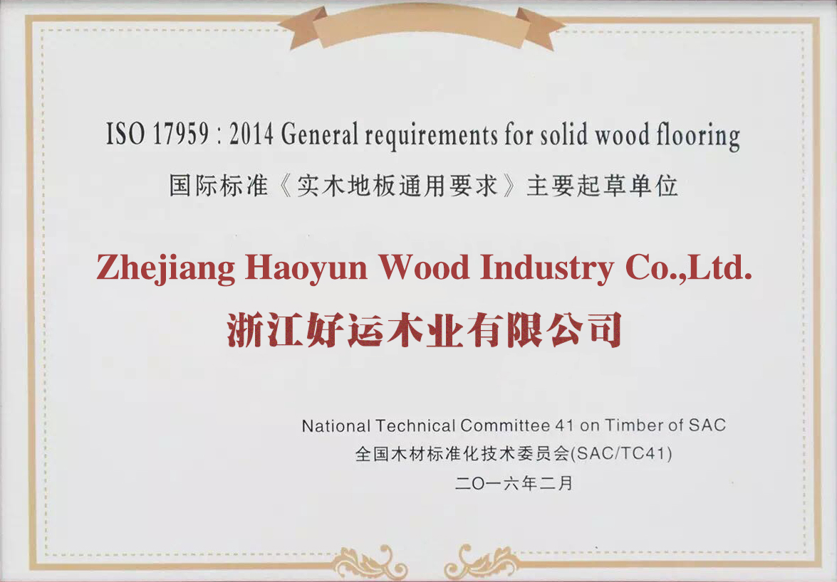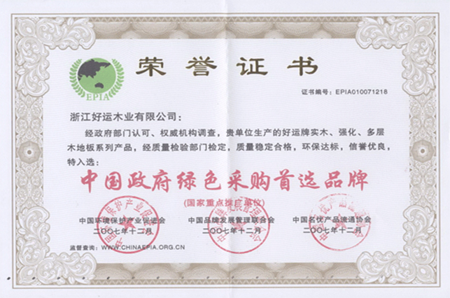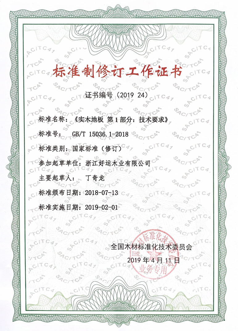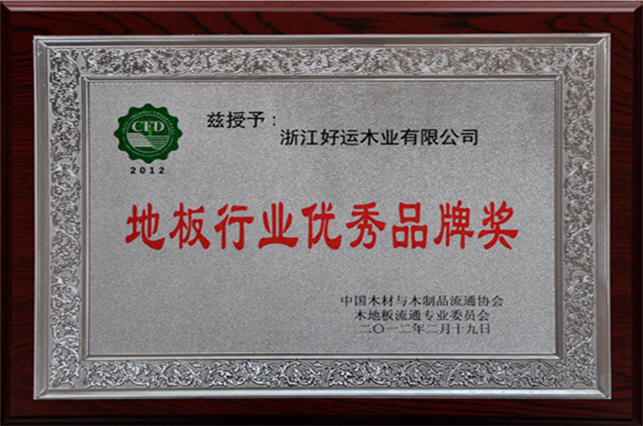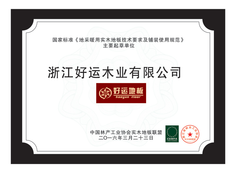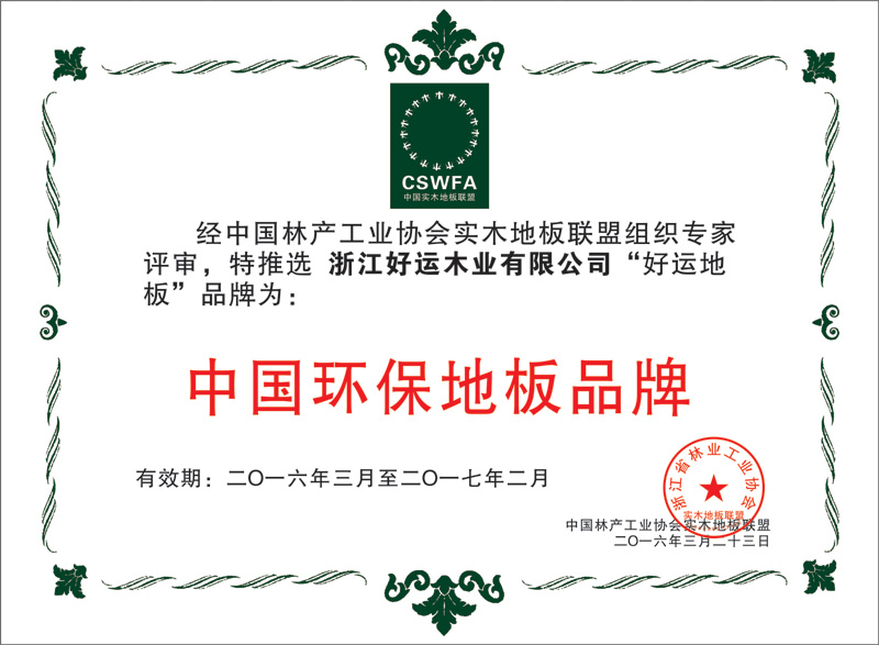 好运木业中国林产工业协会地板专业委员会理事单位、中国木材流通协会地板委员会理事单位、国家标准《实木地板 》主要起草单位、国家标准《地采暖用实木地板技术要求及铺装使用规范》主要起草单位、中国实木联盟执行主席单位。先后通过了ISO9001:2000质量管理体系认证和ISO14001:2004环境管理体系认证,荣获“浙江省名牌产品”、“浙江省知名商号”、“浙江省诚信企业”“科技创新奖”“木地板行业消费者信得过十大品牌”;“全国家居建材行业十大诚信企业家”“第十届浙江省消费者信得过单位”、“浙江制造认证证书”等荣誉称号;连续4年荣获“地板30家产品质量与售后服务双承诺企业”称号、好运地板畅享健康家居生活,积极践行绿色环保承诺。从思想上和行动上,宣传保护生态环境好处,并积极投身公益环保事业先后荣获“中国绿色公益使者”、“中国环保地板品牌”、“绿色实木地板”称号,2019年通过国家级绿色产品认证,浙江制造认证品牌。