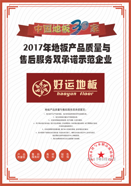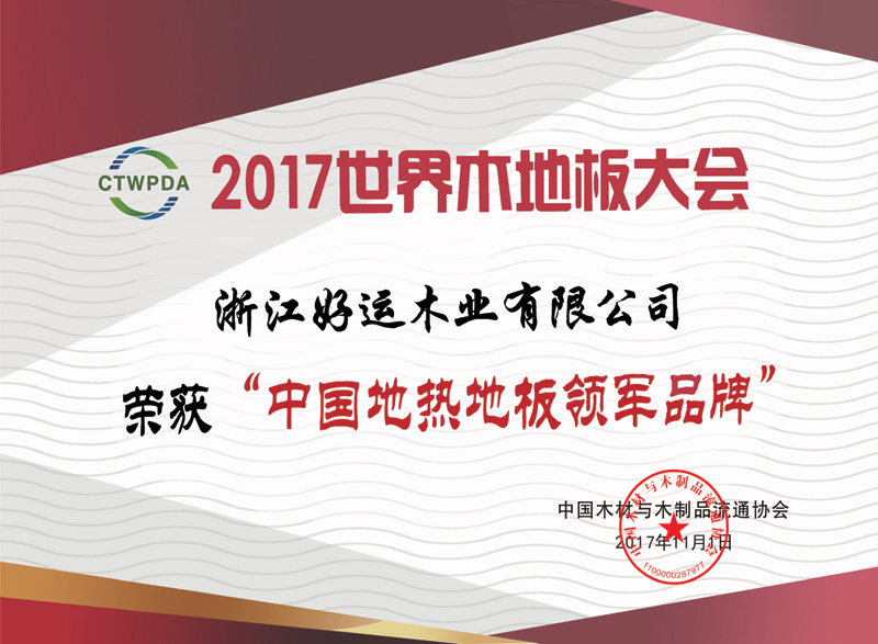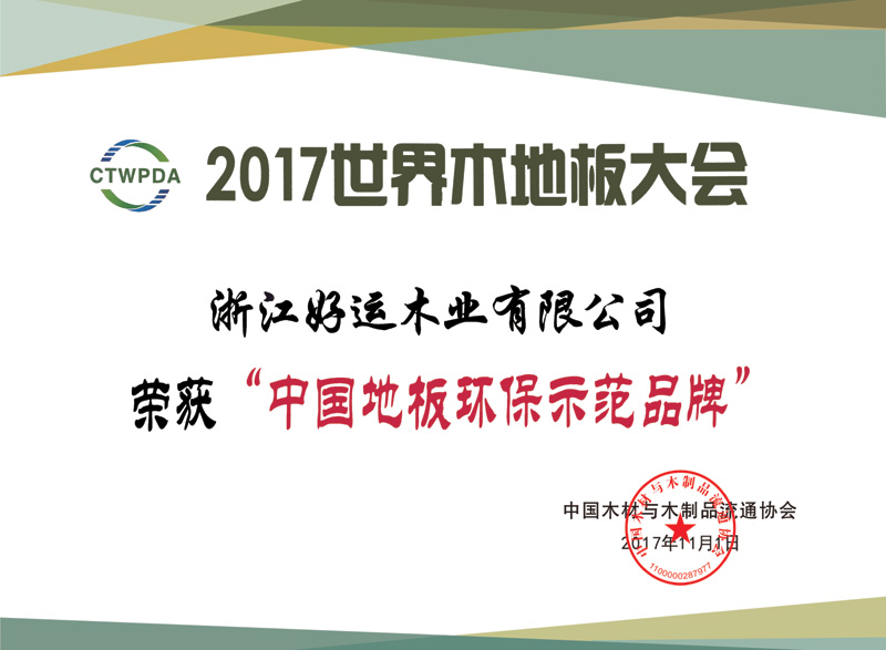 2017年11月,好运地板被世界木地板大会组委会授予“中国地板环保示范品牌”荣誉。