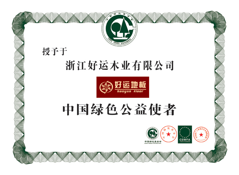 2016年2月,好运地板携手中国实木地板联盟向中国中国实木地板联盟企业向中国绿化基金会捐赠100万元人民币,用于支持绿色公民行动"守护珍禽王国—湿地保护"项目,好运地板被授予“中国绿色公益使者” 荣誉称号!