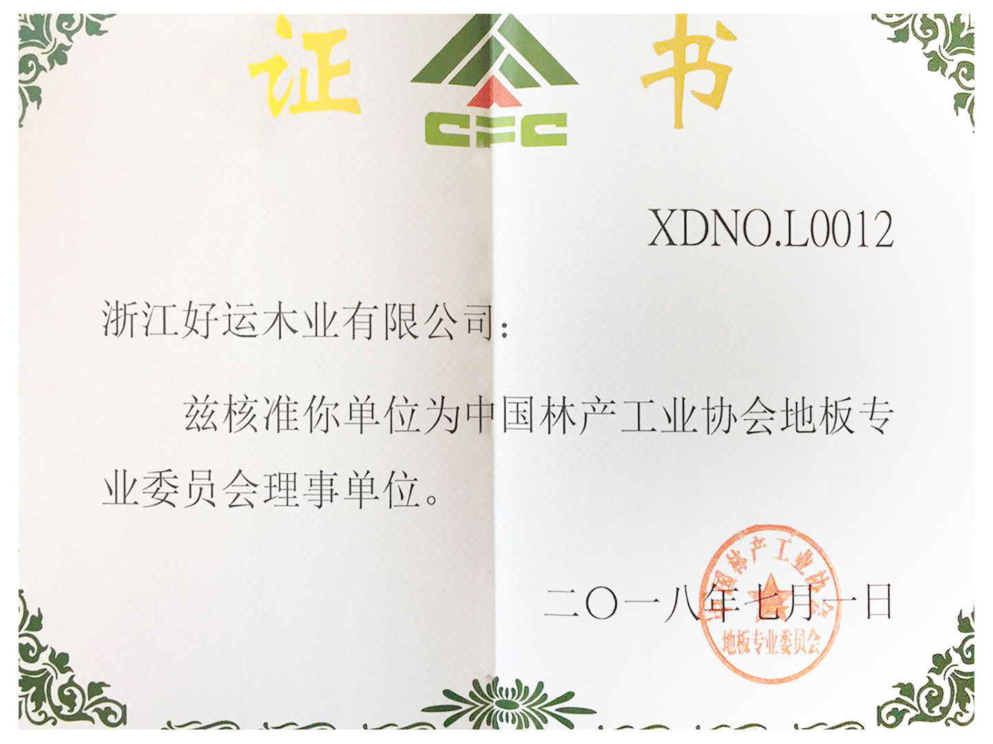 2018年3月,倡导绿色发展理念,助推行业绿色发展,好运地板被世界绿色家居发展组织授予获“绿色实木地板”荣誉。