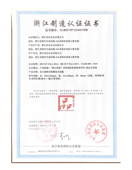 “品字标浙江制造”分量有多重?从2014年起,浙江省委省政府在全国范围内率先提出实施标准强省、质量强省、品牌强省战略,着力推进“品字标浙江制造”品牌建设工作,以标准和认证为有效抓手,通过高标准的运用实施来引领高品质发展,对符合高标准、高品质要求的浙江产品进行整体培育,核心内涵是“浙江质造”“浙江创造”,可谓是着力打造这块金字招牌。经过几年的培育,“品字标浙江制造”成为集质量、技术、服务、信誉为一体,经市场和社会公认,整体反映浙江制造先进性的区域品牌形象标志。这张“浙江制造”的荣誉证书,也将始终督促着好运地板,迈向更高的品牌成就,传承以品质为先的好运匠心。