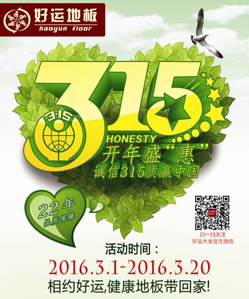 在3.15即将来临之际, “中国实木地板联盟”执行主席单位好运地板全国线下专卖店联合启动“开年盛惠 诚信315质赢中国”315主题活动,各大系列产品全线大幅度让利,微信扫码,进店有礼、满减再送、零利润超值大力度优惠,让你轻松享受把好运带回家。此次活动为新老顾客准备了多重让利优惠和服务,以此感恩新老顾客的支持和厚爱,帮助顾客实现对美好家居生活的渴望和向往。