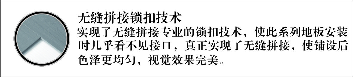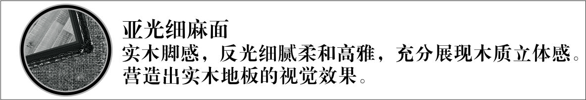 极富创作力的【双面伊人/古往今来】6系列防实木地板视觉效果,采用上等的防潮基材其密度、板身强度全面优于国家相关标准,不易变形,选用与实木相近纹路的进口装饰纸,减少对原始森林的破坏,绿色环保处理工艺达到了国际环保要求E1环保(甲醛释放检验≤1.5mg/L)。