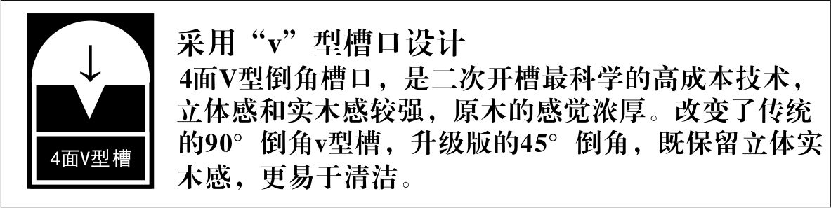 V型槽地板是采用二次价格倒角,不损伤强化地板耐磨层,在日后的地板保养和使用上避免倒角磨损,延长使用寿命,流畅的线条更具现代时尚感另外,V型槽采用榫槽密封技术(一般用液态蜡或水性涂料),用液态蜡喷涂在榫槽的未饰面部份,大幅度减缓板内水汽与外界环境的交换,达到防止地板受潮变形和减少地板缩胀率。